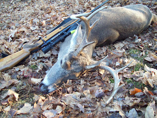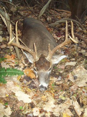 It was 64 degree's and raining. I thought there would be minimal deer movement. Was I ever wrong. This buck just appeared from thin air about 3:30 pm. I blew a chance at a smaller buck on another property in the morning. I failed to sneak out on a point overlooking a brushy old field and glass it. Instead I lazily drove the quad around the corner of the timber and off he went with his lady friend.He was nice but smaller that the one I was fortunate to take.